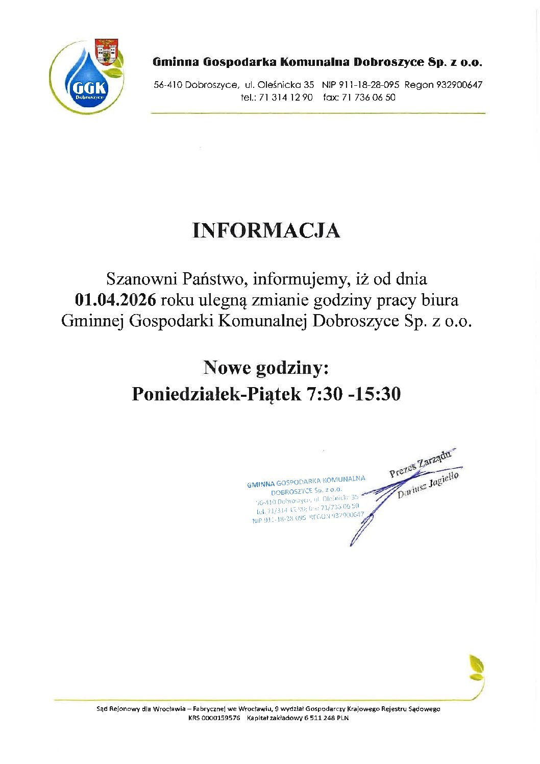 1) Administratorem Pani/Pana danych osobowych jest Gminna Gospodarka Komunalna Dobroszyce Sp. z o.o., 56-410 Dobroszyce, ul. Oleśnicka 35.