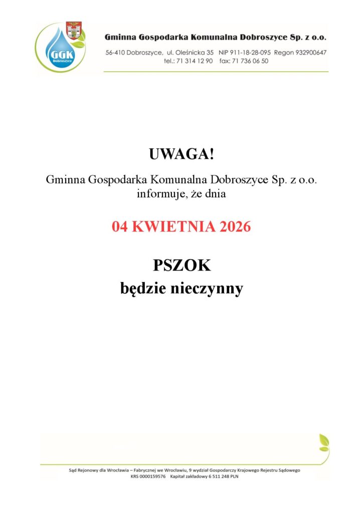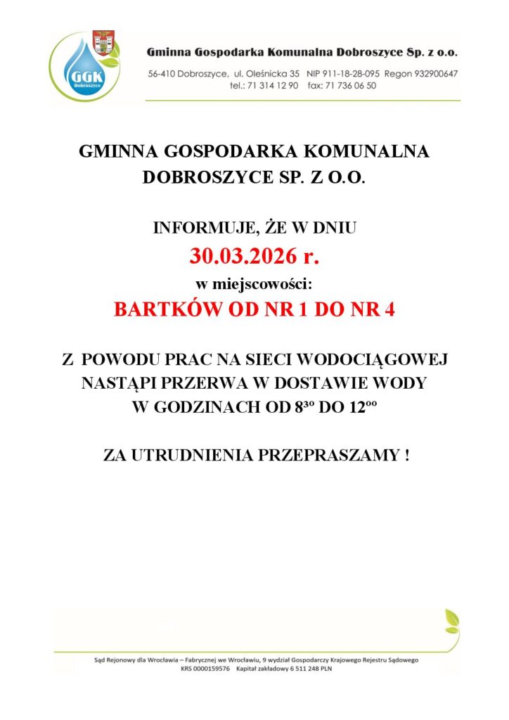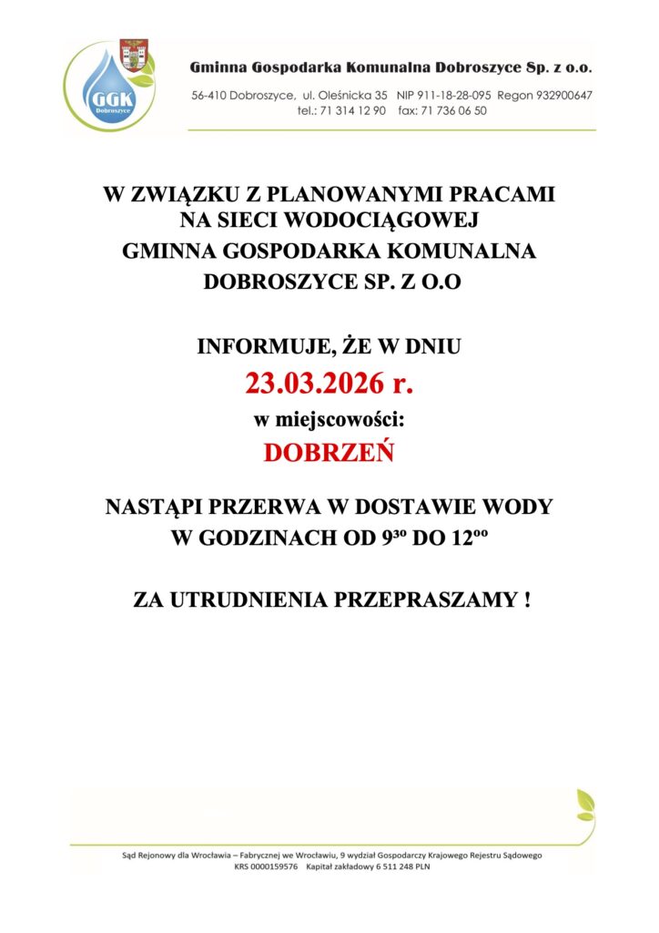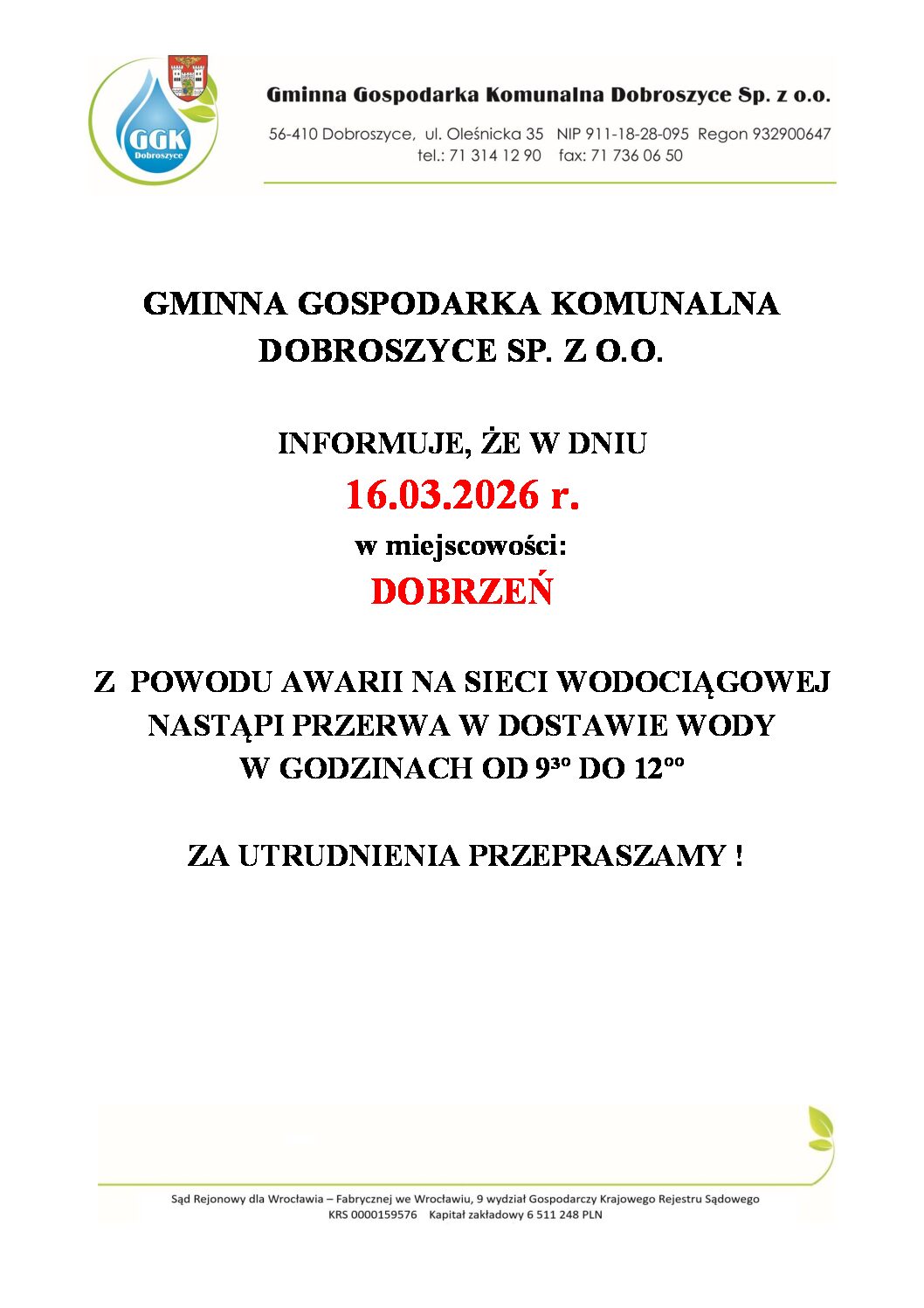 Gminna Gospodarka Komunalna Dobroszyce Sp. z o.o informuje,że w dniu 14.04.2026 w miejscowości Siekierowice od nr 36 do nr 41 z powodu uszkodzenia sieci wodociągowej nastąpi przerwa w dostawie wody. Za utrudnienia przepraszamy!